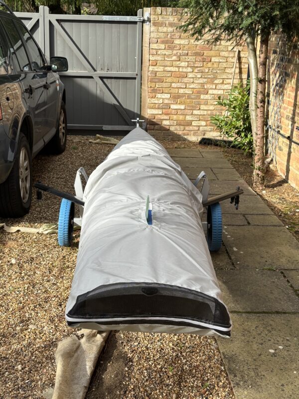 It is 4.5m long, 0.75m wide and weighs circa 27kg and comes with a quick release rigger, foam seat, flex feet on the footplate and a pair of sculls